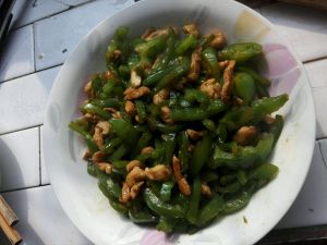 在锅里加少量油,加入青椒翻炒2分钟,下肉丝,加少许盐,均匀的翻炒5分钟就可以起锅了。