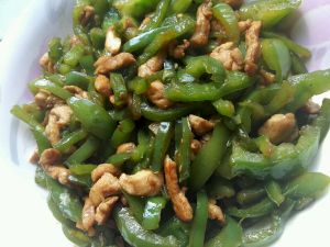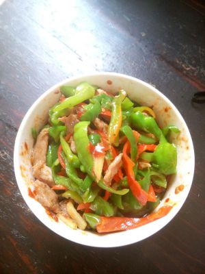 用姜末炸锅,倒入肉丝翻炒一分钟,再倒入青椒翻炒,加入十三香、盐再翻炒,快熟后加入鸡精出锅。