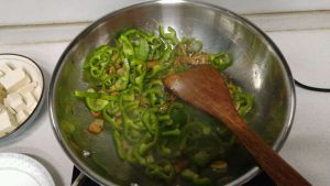 放入柿子椒和尖椒,出锅前放入鸡精调味(不用再加盐了,黄豆酱的咸味足够了)