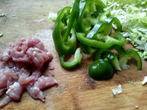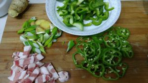 切肉,切青椒,切姜,肉放到碗里用酱油腌治