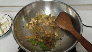 葱,姜,蒜,五花肉下锅炒一下,放入黄豆酱翻炒均匀