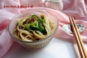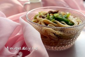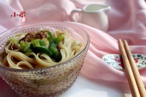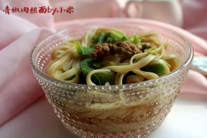 热锅冷油煸炒肉丝,盛出待用,另外煸炒青椒丝,待其熟之际和肉丝再一起煸炒,加入鲜酱油,葱花即可,做为面的浇头盛入盘中