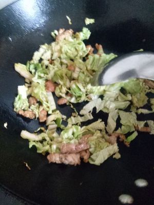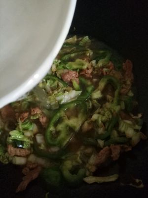 锅里热油,炒肉丝,变白后倒入生抽,分别把白菜和青椒倒进去翻炒3分钟,加入适量盐