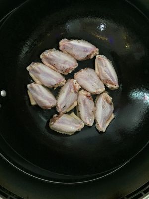 热火加入适量冷油。油热后下入鸡翅煎制,注意先煎打过斜刀的一面。煎至两面金黄。