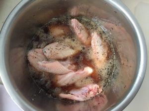 将鸡翅中洗净沥干,放入料酒、胡椒粉、生抽腌制半小时。
