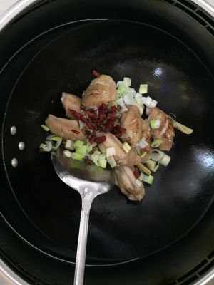 炒锅内适量油,油热后用花椒炸香,然后放入葱姜稍煸出香味,放入鸡翅翻炒至断生后倒入可乐。