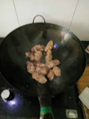 热锅,大概放三勺油,油热之后,将之前切好的蒜放入锅里翻炒几下,再将腌好的鸡翅放入锅里(注:要把酱油沥干),翻炒至鸡翅微焦,然后再倒入半听可乐,改为小火慢炖。