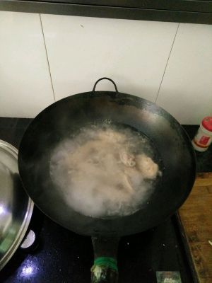 在锅里加入适量冷水,再将洗净的鸡翅和切好的姜片放入锅里,煮一会儿,沸腾两分钟之后起锅。将鸡翅在冷水下冲洗干净。
