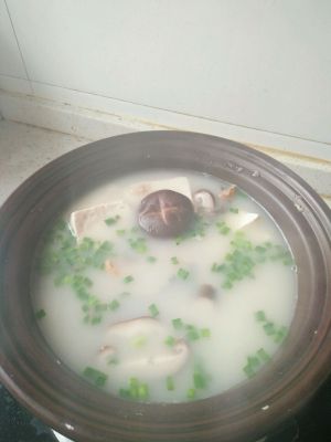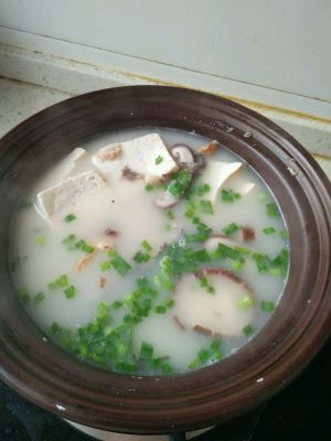 盖锅盖煮至汤变成奶白色 加入豆腐 香菇 改小火炖5-7分钟 加葱花就可以出锅啦 (家里没有小葱了 用韭菜充数