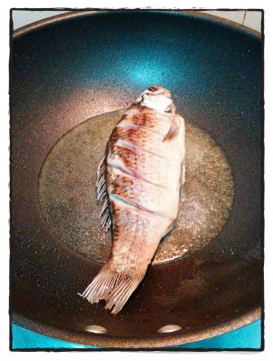 不粘锅加热,倒入一层油,油温八成热放入鱼,(注意溅油)两边煎微黄。