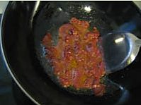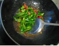 倒入红绿椒后,用芡汁勾芡,淋香油炒匀迅速盛出即可