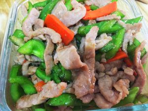 用淀粉 鸡精 料酒 食用油喂牛肉15分钟 同时 青椒切丝用少量盐拌匀 待用 胡萝卜切丝