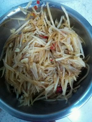 开锅,热油,将蒜放下去爆香(小心溅出),再放辣酱炒几下,再放土豆丝。翻炒几下,加入陈醋和盐,快速翻炒。