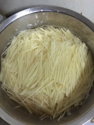 土豆洗净削皮用削皮器切丝(刀工好,切的也行)切丝后洗净淀粉晾干水份,放两勺白醋进去拌匀