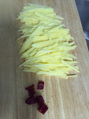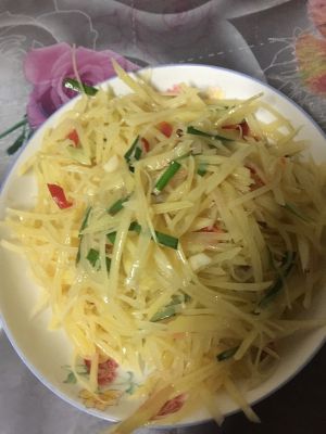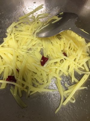 倒入土豆丝翻炒两分钟,快出锅时加盐和白醋即可。