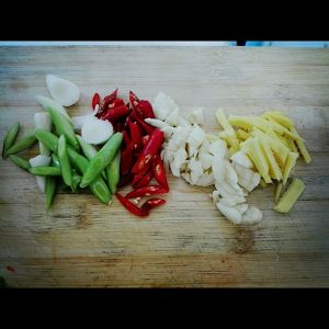 将龙虾洗干净,去虾线后,备用。然后把,土豆,洋葱,藕,青椒,灯笼椒洗净切片,黄瓜切条备用。蒜和姜切片。