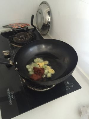 锅烧热炒香葱姜蒜、麻辣香锅料