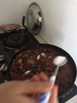 再加入2勺蚝油,2勺酱油,试一下咸淡,味道可以就不需要再加盐了,大火煮15分钟左右,最后收一下汁