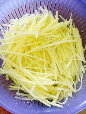 土豆削皮,切丝(想偷懒也可用刨丝的工具)切出来来的丝不能太细太粗,太细影响口感,太粗难熟且难入味!