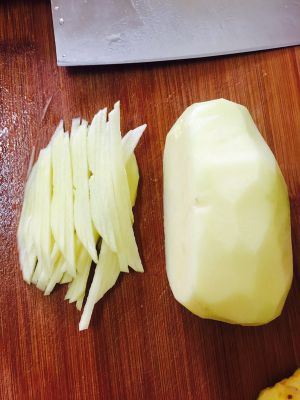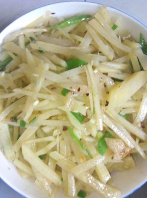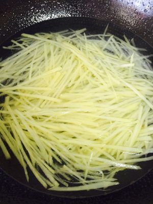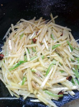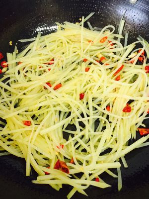 放入切好的土豆丝翻炒,放入盐、味精、白醋。