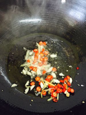 锅里下油。等油锅热了,转小火,冷却下,再下姜,蒜,辣椒炒香。