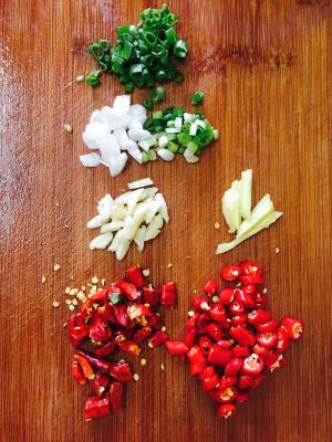 辣椒,切好。葱,蒜,姜,干辣椒,切好备用。