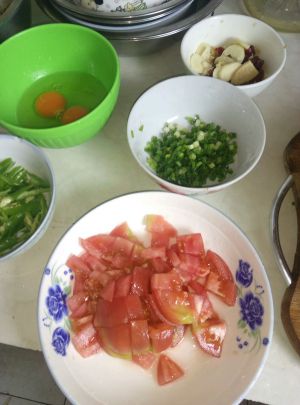 备好的食材,指天椒切段、干朝天椒切段、大蒜切颗粒,姜切丝,葱切葱花。
