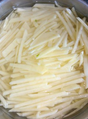 准备好一个削了皮的土豆,然后切成丝(土豆丝一定要均匀,焯水和炒的时候容易熟透)切好的土豆丝放在一个装有水的容器里,以免变色。