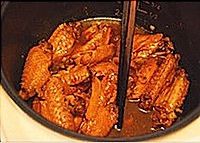 等见到出气口开始有蒸气冒出时,掀开盖子,用筷子或铲子把鸡翅拌一下,以使每块鸡翅上色均匀