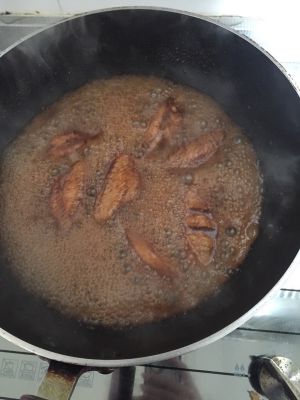 另启一锅 热锅凉油 放入葱段 姜片 爆香 加入鸡翅 倒入可乐 可乐漠过鸡翅既可 加入少许盐 适量糖 中火炖至四五分钟 可加一丁点水淀粉 最后大火收汁 成出既可