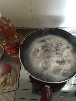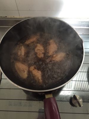 2、把水烧开,放姜片、花椒、料酒。把鸡翅抄一下。鸡翅表面变色即可。