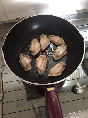 5、倒入鸡翅大火爆炒。当鸡翅表面成金黄色即可倒入可乐。可乐只需盖住鸡翅既可。