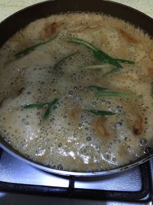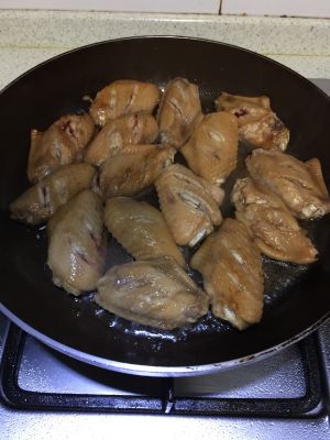 鸡翅根煎至金黄色,放入姜丝炒一会。