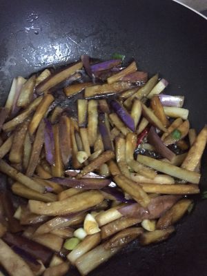 炒香配料后加少许高汤烧开下炸好的茄子大火煸炒一分钟
