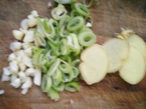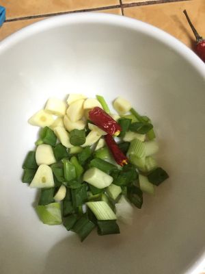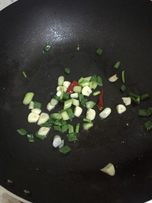 再往锅里倒入适量油,将葱蒜辣椒煸出香味~