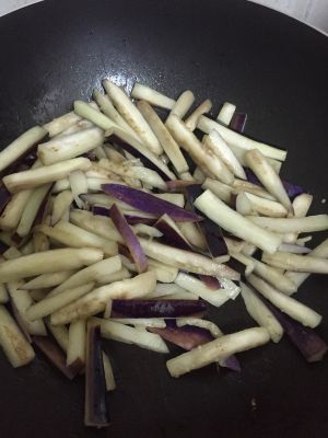 茄子洗净切条,用盐水侵泡10分钟后捞出,挤干水分~
