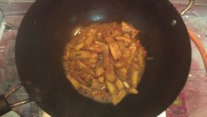5,配料烧香放入茄子烧,烧一会放入配料汁。