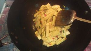 3.锅内放油烧热将配料炒香。