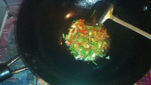 锅底留油,爆香葱蒜和绿红椒丝。