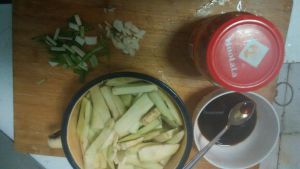 茄子去皮,切条。加盐脱水。