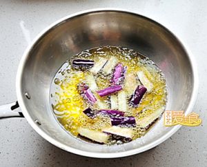 锅中放入适量油,烧7成热,把茄子放入略炸发黄即盛出。