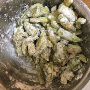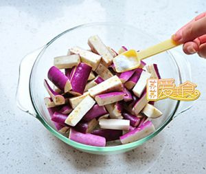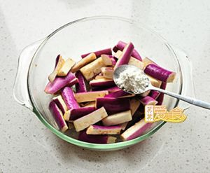 把腌好的茄条里的水去掉,加入淀粉拌匀。(喜欢可以加入鸡精)