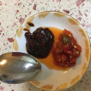 郫县豆瓣酱半勺,剁椒酱多半勺。