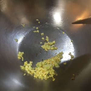 葱姜、一半蒜炒香。