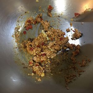 热锅凉油,煸炒肉馅,加入郫县豆瓣酱
