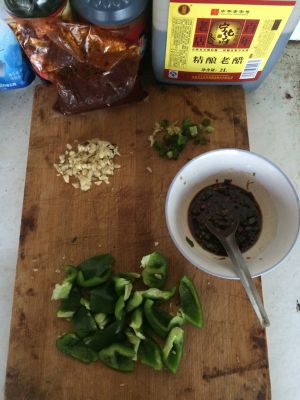切好蒜末,青椒,用手把腌好的茄子攥干待用