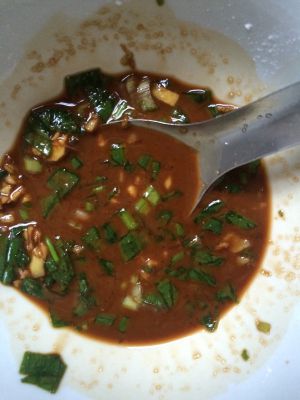 调酱汁:葱末,姜末,一勺醋,两勺酱油,一勺料酒,一勺淀粉,两勺白糖。调好备用
