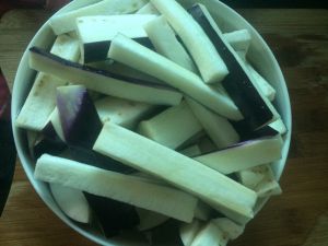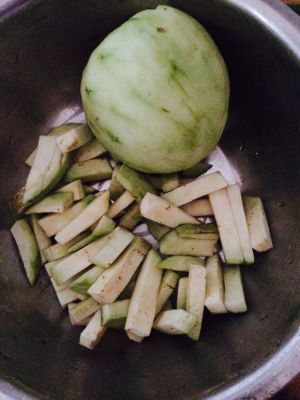 长条茄子切2厘米左右长条,切好后加水泡着待用,以免变色,十分钟左右捞起沥水待用