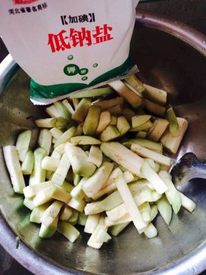 切好的茄子过水微微湿润,撒上盐抖匀,防止氧化发黑,并且把水分杀出来