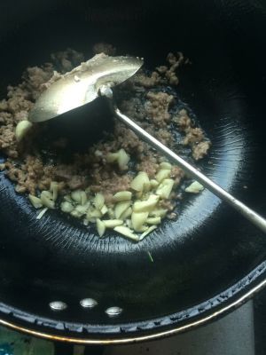 茄子炸干以后捞起,锅里剩油放入花椒粒爆香,捞起。再放入肉末大蒜粒煸炒出香味